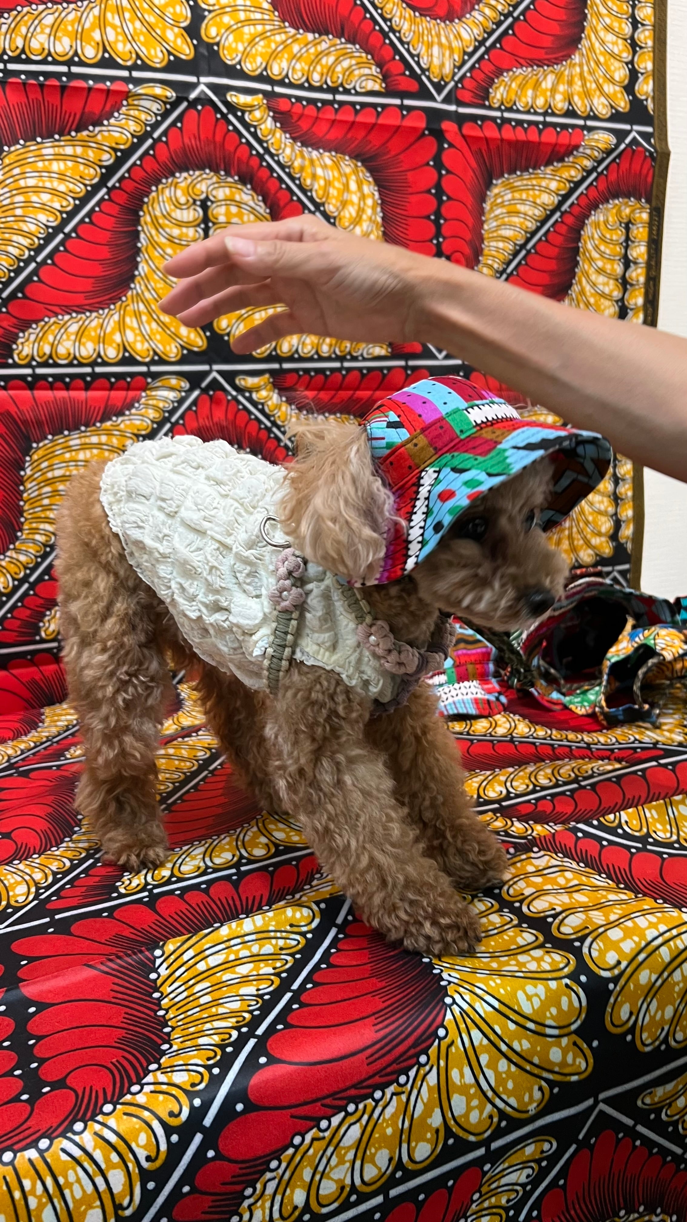 すべて1点もののアフリカ布を使用した、独自のデザインが魅力です。縁取り柄は当店にお任せいただきますが、もし特別なご希望があれば、お気軽にリクエストしてください。お近いお色味をお選びします。あなたの愛犬とのお出かけが、より華やかで楽しいものになることでしょう!