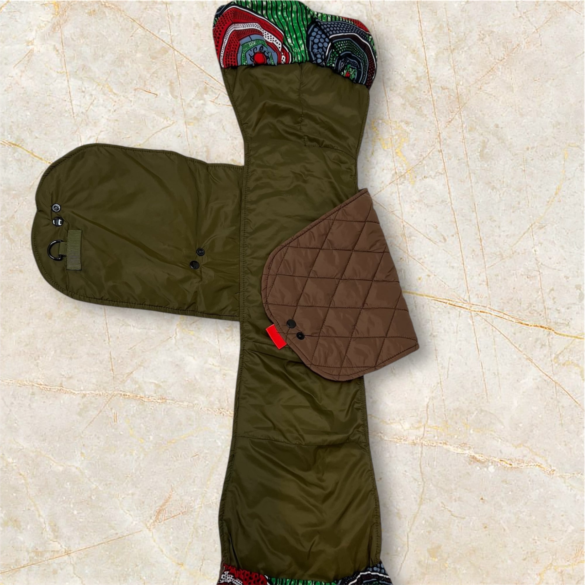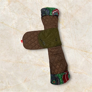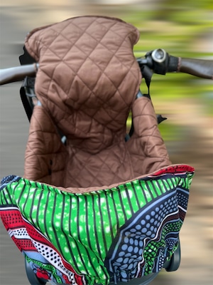 グレーとベージュのシックな色合いに、背中部分にはアフリカン生地を使用したワンポイントデザインが施されています。この独自のアクセントが、愛犬が過ごす空間におしゃれさを引き立てます。シンプルでありながらも、インテリアにぴったりなスタイルを実現しました。毎回のお出かけが、より楽しくなることでしょう!