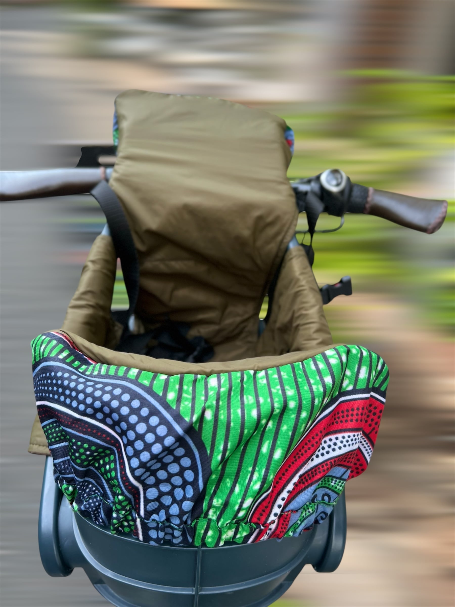 リバーシブルデザインで気分に合わせて使うことができます。ネームタグを取り付けられるように邪魔にならない場所にDカンをつけました。ワンポイントアクセントにアフリカン生地を背もたれ部分に使いました。柄はお任せ下さい。