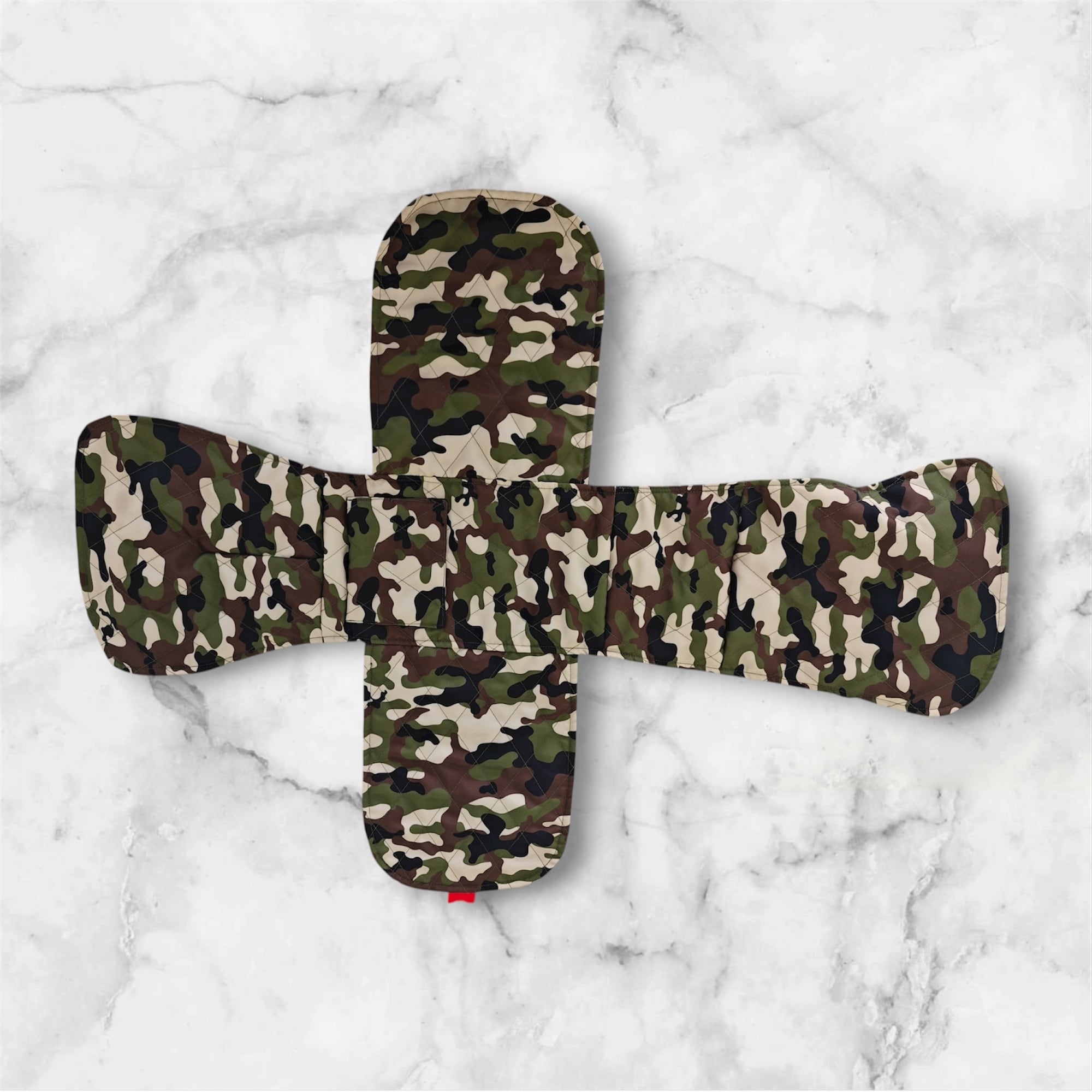 独自の迷彩模様とブラックの組み合わせは、スタイリッシュでありながら実用性も兼ね備えています。どんなシーンにも合わせやすいデザインで、愛犬と共にお出かけする際に、素敵なアクセントを加えます。
